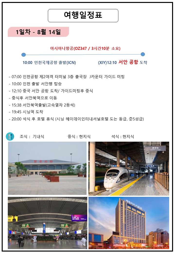 - 07:00 인천공항 제2여객 터미널 3층 출국장 J카운터 가이드 미팅 - 10:00 인천 출발 서안행 탑승(OZ347) - 12:10 중국 서안 공항 도착/ 가이드미팅후 중식 - 중식후 서안북역으로 이동 - 15:38 서안북역출발(고속열차 2등석) - 19:45 시닝역 도착 - 20:00 석식 후 호텔 휴식 (시닝 헤이데이인터내셔널호텔 도는 동급, 준5성급) |
