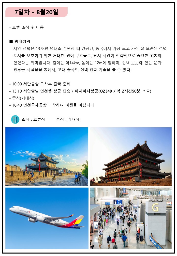 귀국 : 2026-08-20 (Thu) XIY 13:10 ~ ICN 17:00