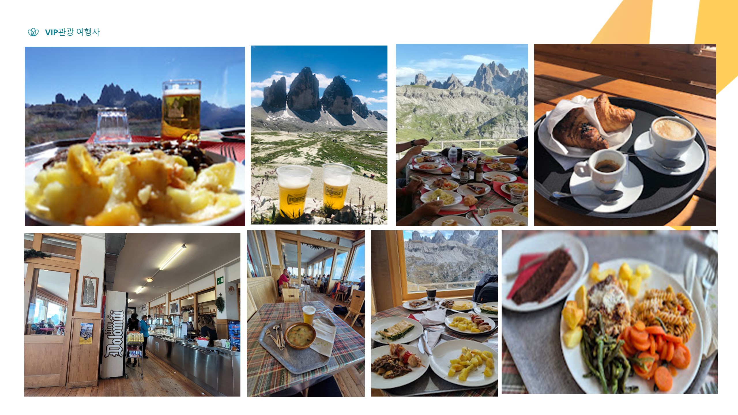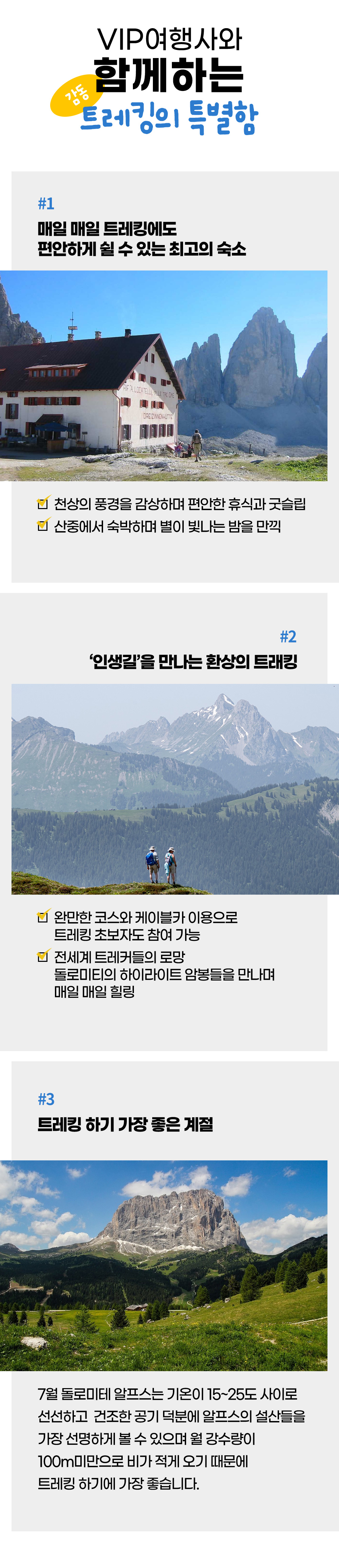 ■ 트레치메 ■ ◈ “돌로미테의 하이라이트” 트레치메 디 라바레도(Trecime di Lavaredo) 트레킹 돌로미테 산군에서 가장 유명한 트레치메디 라바레도는 세 개의 봉우리로 이뤄진 거대한 암봉입니다. 아우론조 산장에서 시작하여 시계 방향으로 봉우리를 가운데 두고 한 바퀴 돌아오는코스로 트레치메를 가장 가까이에서 볼 수 있으며, 일몰과 일출의 장엄하고도 아름다운 풍광을 볼 수 있습니다