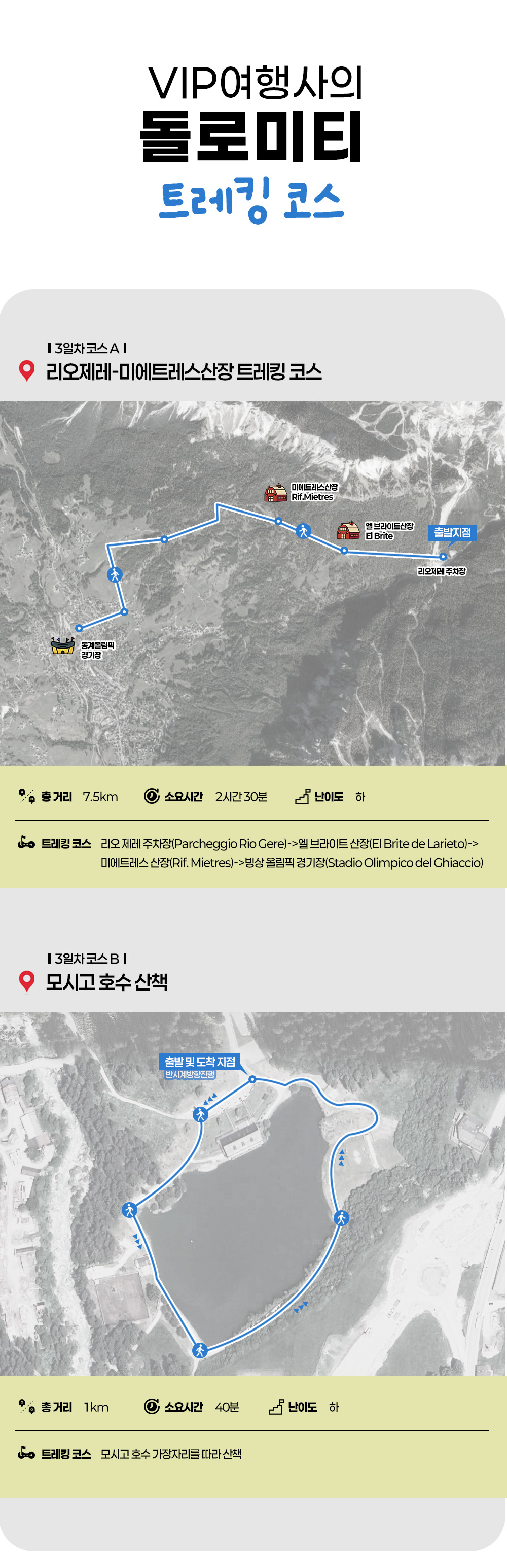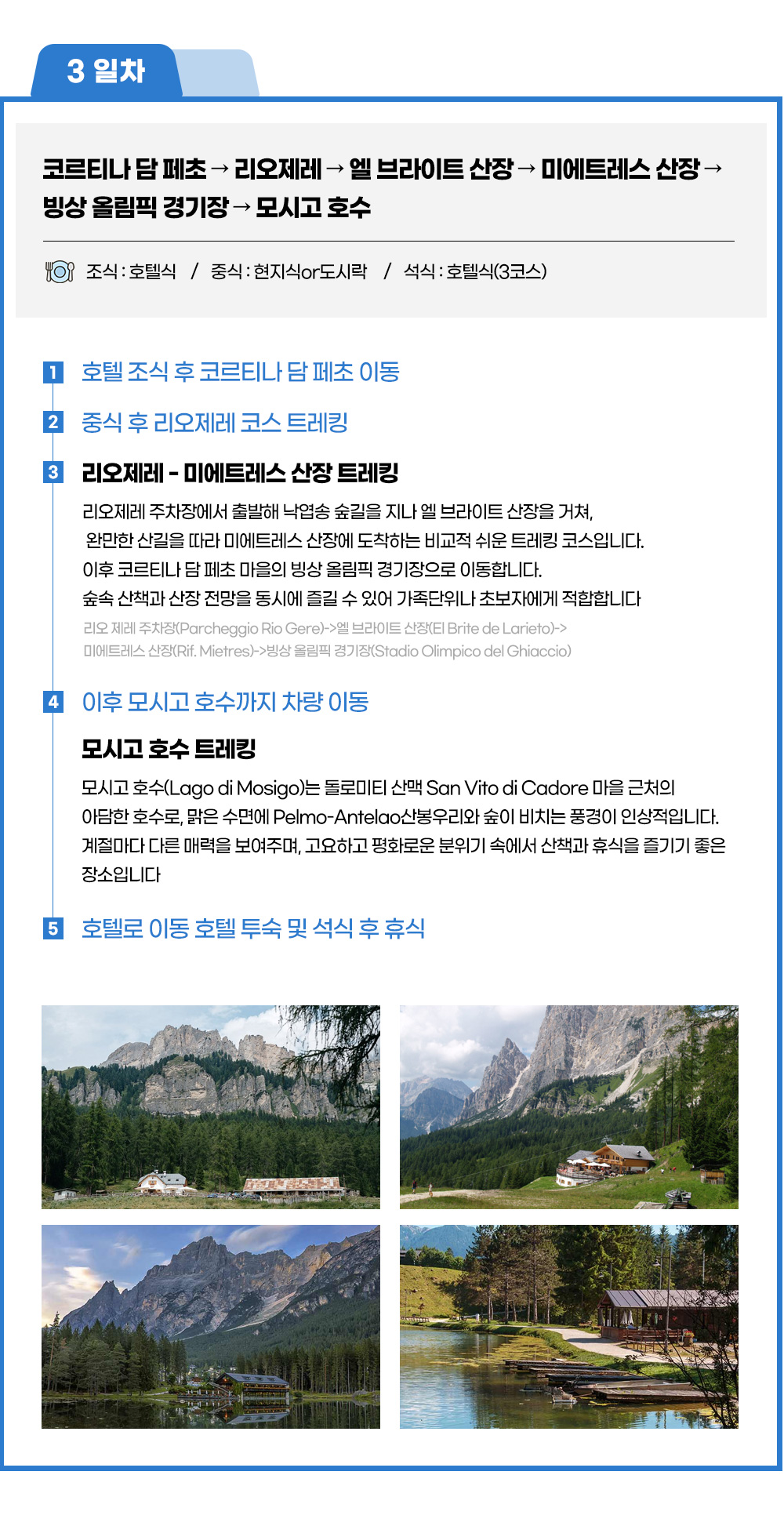 ■리오 제레 – 미에트레스 산장 트레킹■ ◈ 리오 제레 주차장에서 출발해 낙엽송 숲길을 지나 엘 브라이트 산장을 거쳐, 완만한 산길을 따라 미에트레스 산장에 도착하는 비교적 쉬운 트레킹 코스입니다. 이후 코르티나 담 페초 마을의 빙상 올림픽 경기장으로 이동합니다. 숲속 산책과 산장 전망을 동시에 즐길 수 있어 가족 단위나 초보자에게 적합합니다..