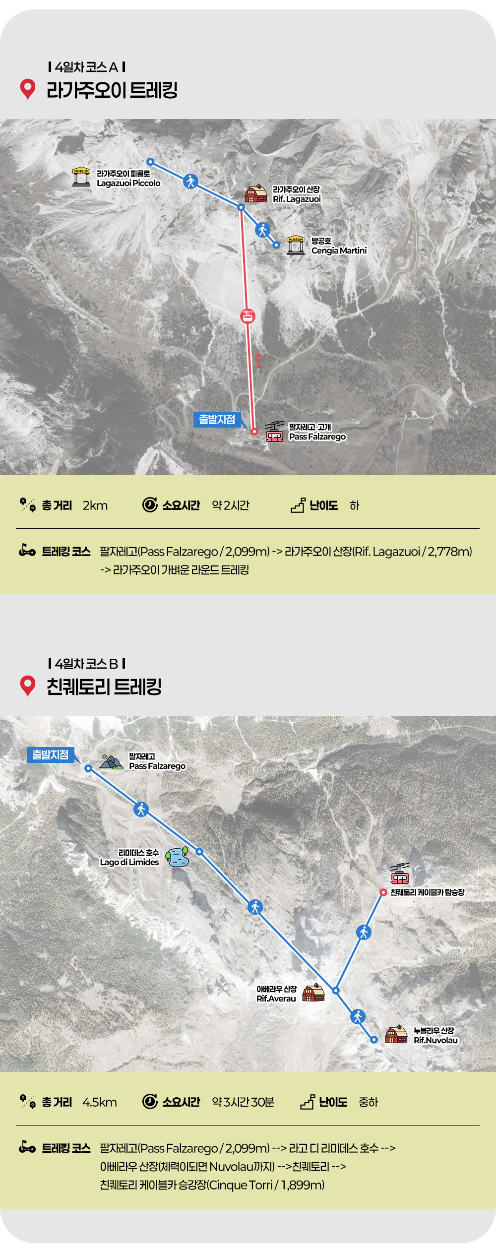 ◑ 루트 : 팔자레고(Pass Falzarego / 2,099m) --> 라고 디 리미데스 호수 --> 아베라우 산장(체력이되면 Nuvolau까지) -->친퀘토리 --> 친퀘토리 케이블카 승강장(Cinque Torri / 1,899m) (소요시간 : 약 2시간 30분 - 3시간 / 거리 : 4.5km)