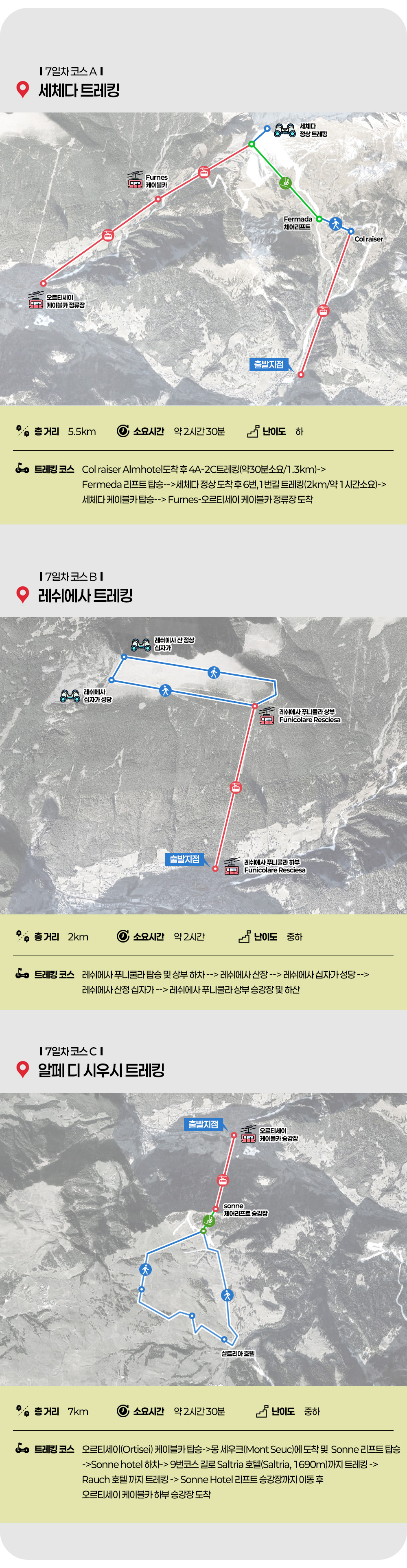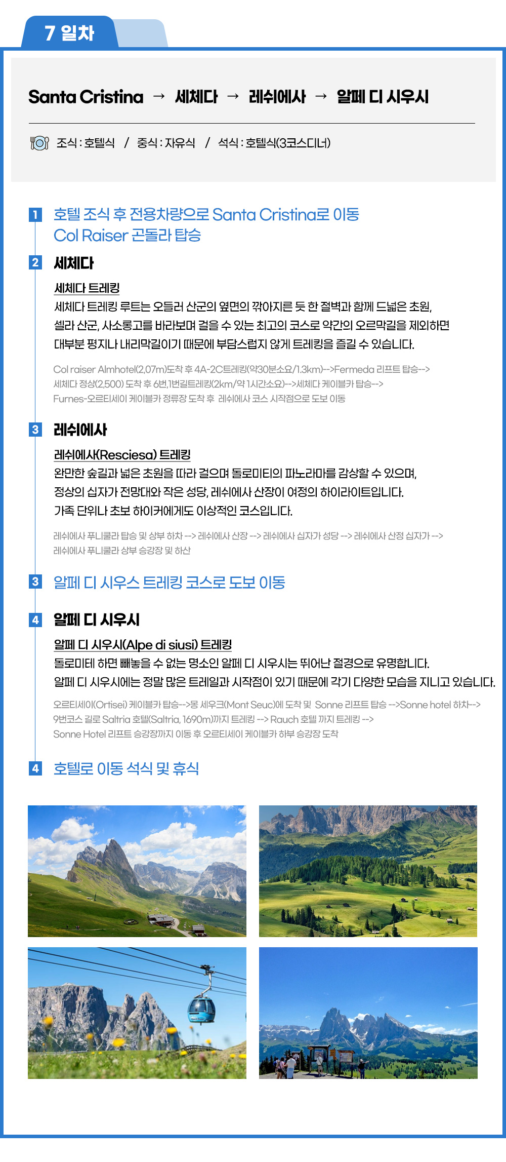 ◑ 루트 : Col raiser Almhotel(2,07m)도착 후 4A-2C트레킹(약30분소요/1.3km)-->Fermeda 리프트 탑승-->세체다 정상(2,500) 도착 후 6번,1번길트레킹(2km/약 1시간소요)-->세체다 케이블카 탑승-->Furnes-오르티세이 케이블카 정류장 도착 후 전용차량으로 알페 디 시우시로 이동