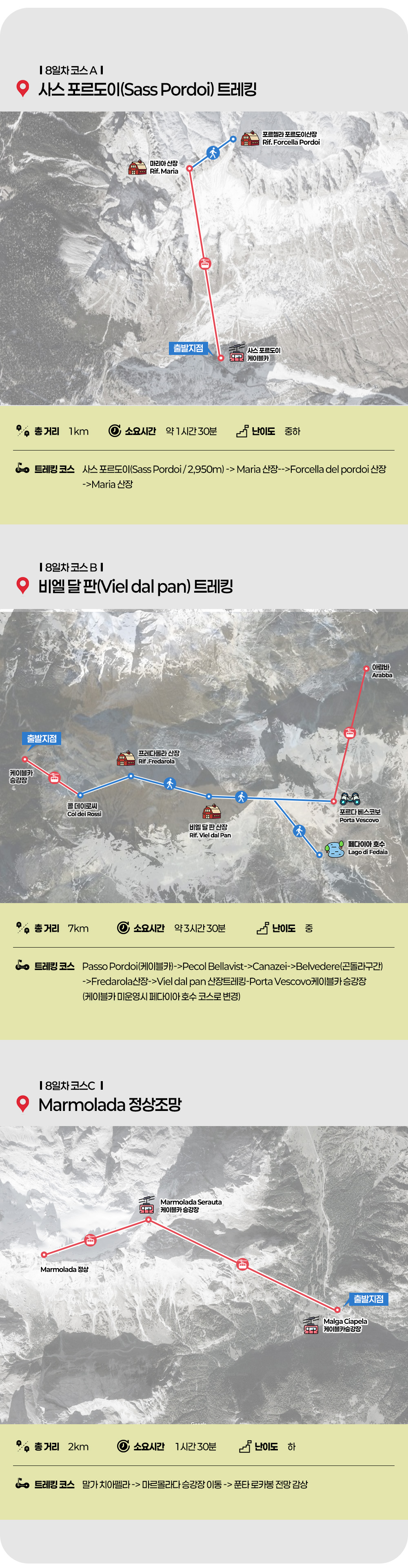 ◈ 비엘 달 판(Viel dal pan) 트레킹 Passo Pordoi(케이블카)-->Pecol Bellavist-->Canazei-->Belvedere(곤돌라구간)-->Fredarola산장-->Viel del pan 산장트레킹(Padon chair)-Porta Vescovo케이블카 승강장