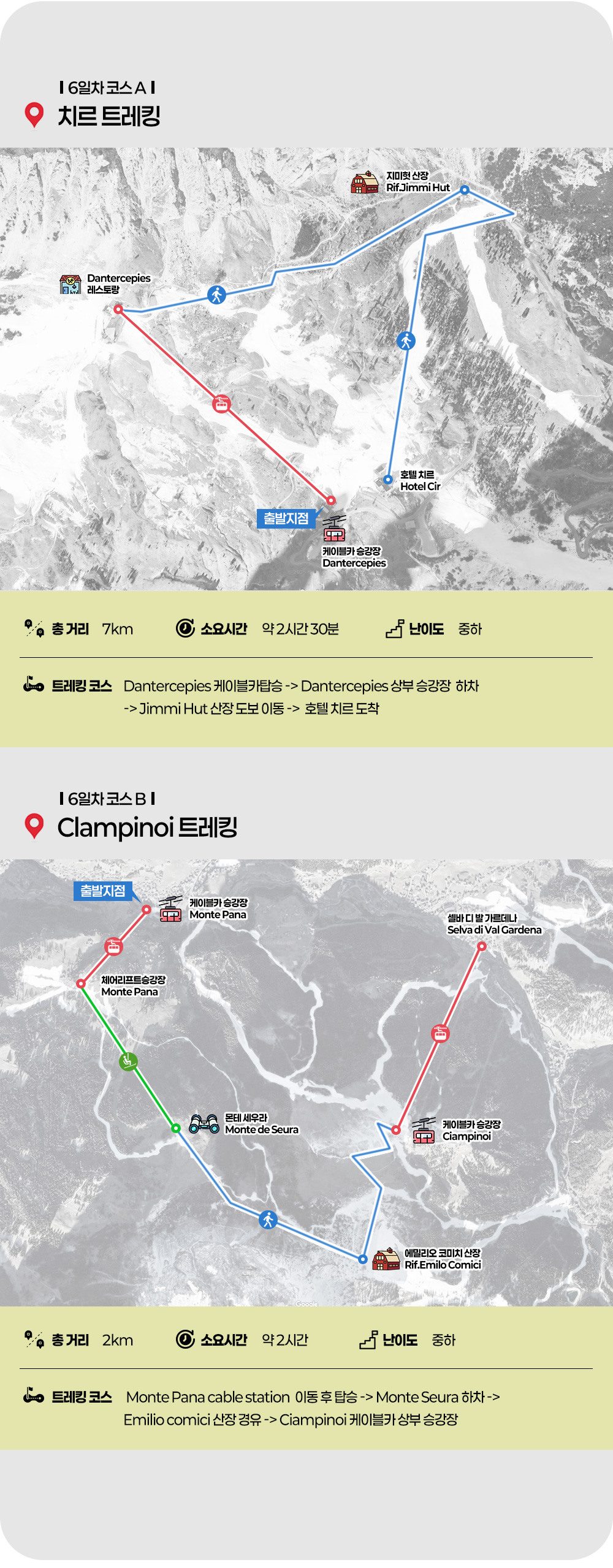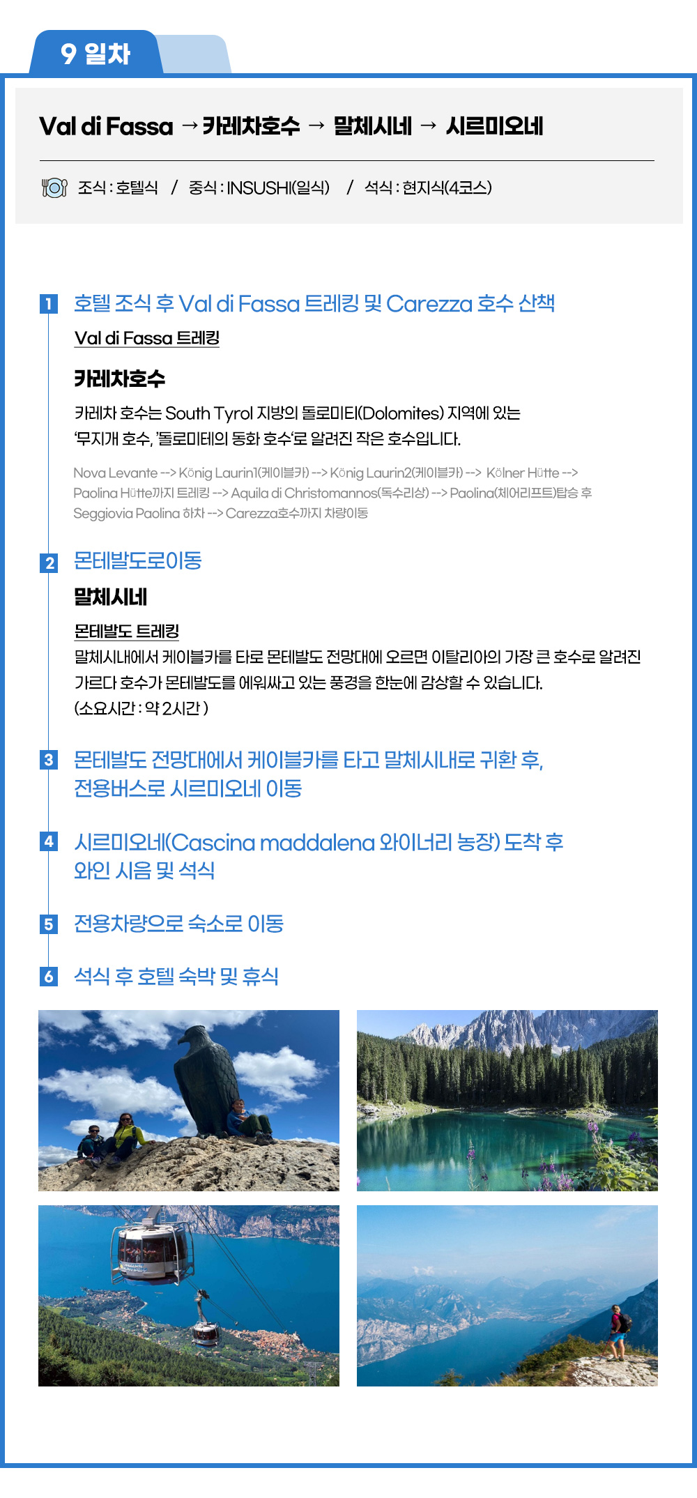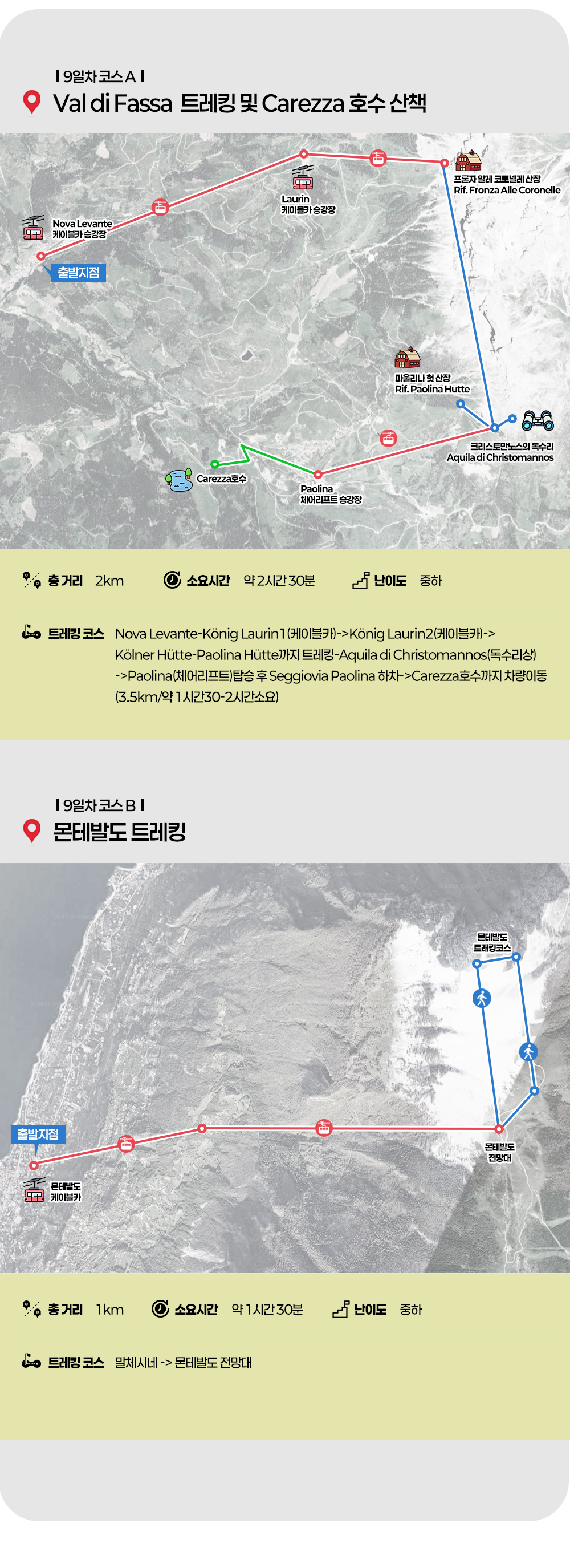 Nova Levante-König Laurin1(케이블카)-König Laurin2(케이블카)-Kölner Hütte-Paolina Hütte까지 트레킹-Aquila di Christomannos(독수리상)-Paolina(체어리프트)탑승 후 Seggiovia Paolina 하차-Carezza호수까지 차량이동 (3.5km/약 1시간30-2시간소요)