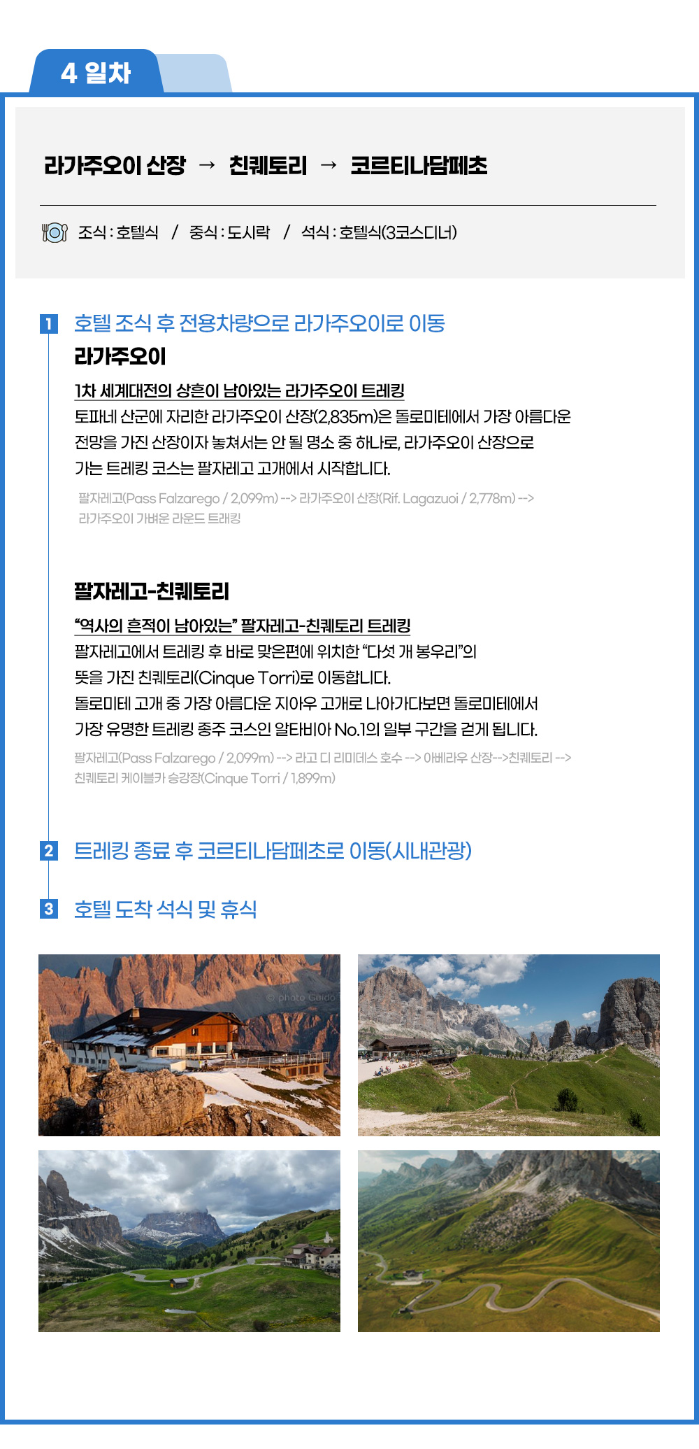 ■팔자레고-친퀘토리■ ◈ “역사의 흔적이 남아있는” 팔자레고-친퀘토리 트레킹 팔자레고에서 끝난 라가주오이 트레킹 후 바로 맞은편에 위치한 “다섯 개 봉우리”의 뜻을 가진 친퀘토리(Cinque Torri)로 이동합니다. 돌로미테 고개 중 가장 아름다운 지아우 고개로 나아가다보면 돌로미테에서 가장 유명한 트레킹 종주 코스인 알타비아 No.1의 일부 구간을 걷게 됩니다.