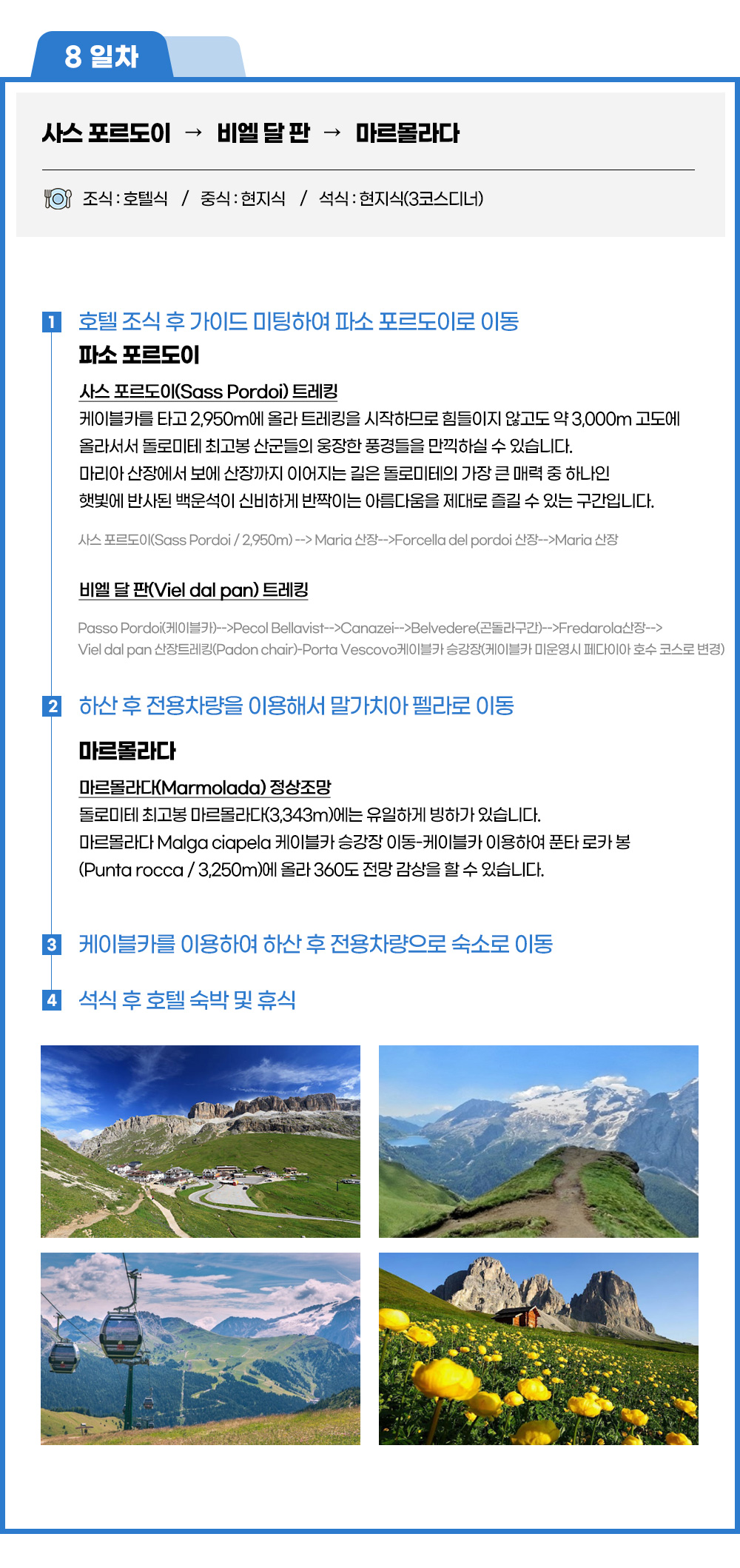 ■파소 포르도이■ ◈ 사스 포르도이(Sass Pordoi) 트레킹 케이블카를 타고 2,950m에 올라 트레킹을 시작하므로 힘들이지 않고도 약 3,000m 고도에 올라서서 돌로미테 최고봉 산군들의 웅장한 풍경들을 만끽하실 수 있습니다. 마리아 산장에서 보에 산장까지 이어지는 길은 돌로미테의 가장 큰 매력 중 하나인 햇빛에 반사된 백운석이 신비하게 반짝이는 아름다움을 제대로 즐길 수 있는 구간입니다.