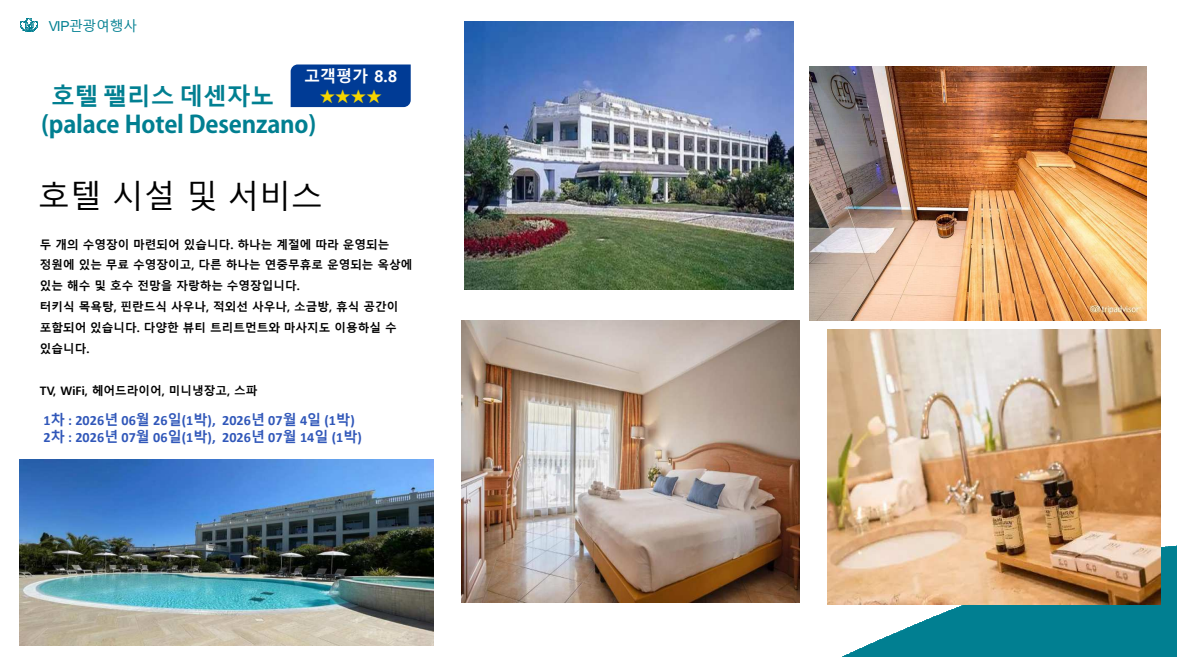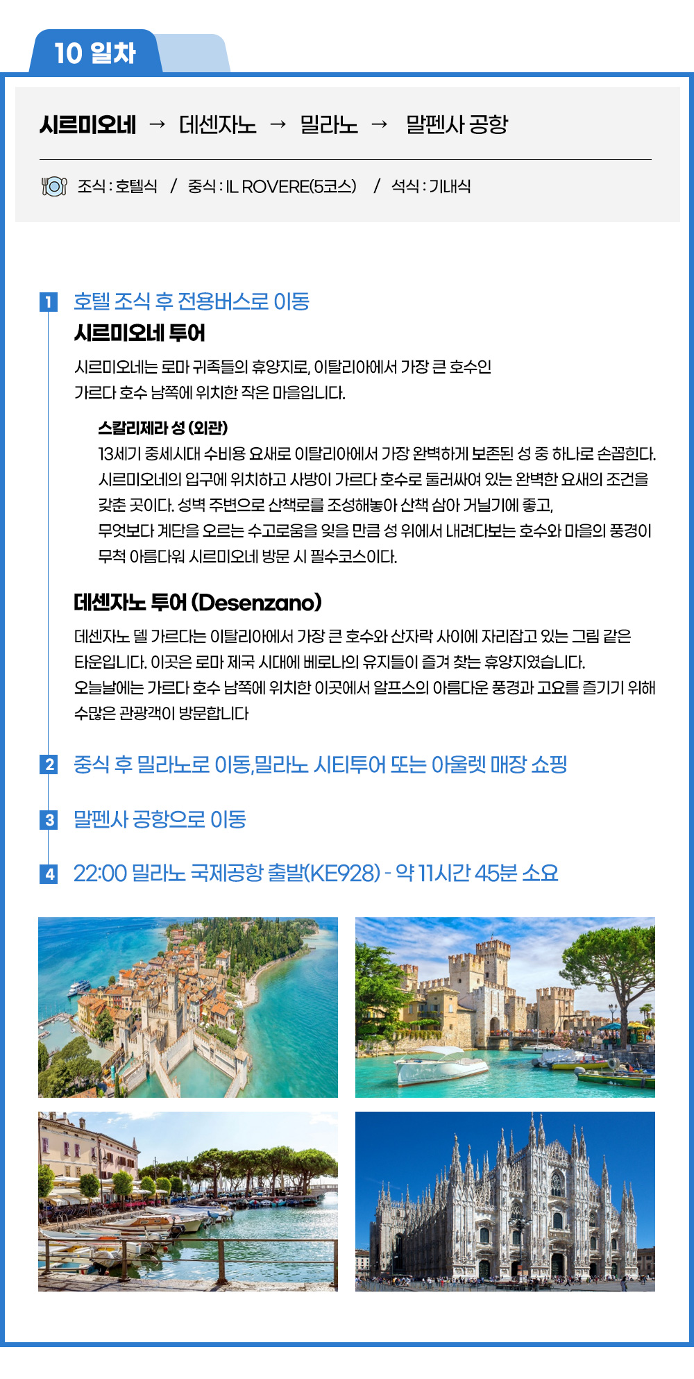 ■ 데센자노 투어(Desenzano) ■ 데센자노 델 가르다는 이탈리아에서 가장 큰 호수와 산자락 사이에 자리잡고 있는 그림 같은 타운입니다. 이곳은 로마 제국 시대에 베로나의 유지들이 즐겨 찾는 휴양지였습니다. 오늘날에는 가르다 호수 남쪽에 위치한 이곳에서 알프스의 아름다운 풍경과 고요를 즐기기 위해 수많은 관광객이 방문합니다