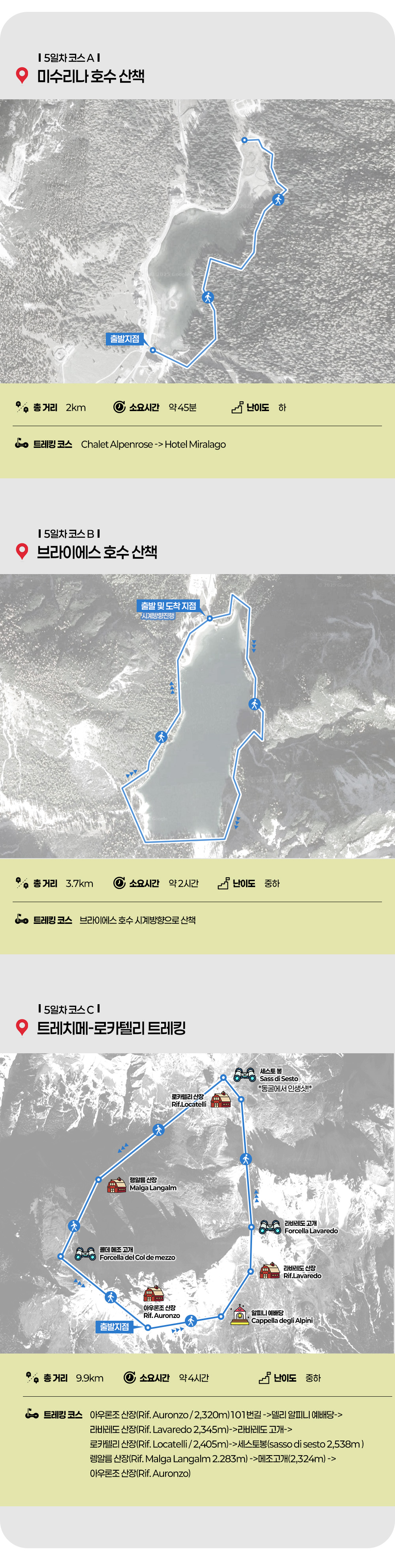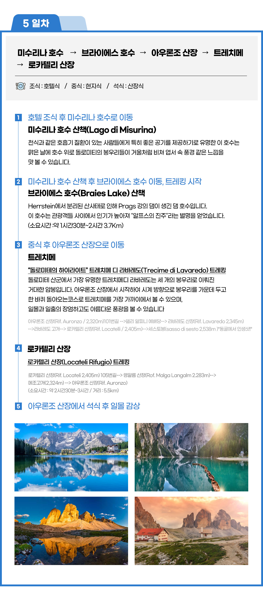 ◑ 루트 : 아우론조 산장(Rif. Auronzo / 2,320m)101번길 -->데글리 알피니 예배당--> 라바레도 산장(Rif. Lavaredo 2,345m)-->라바레도 고개--> 로카텔리 산장(Rif. Locatelli / 2,405m)-->세스토봉(sasso di sesto 2,538m )*동굴에서 인생샷!* (소요시간 : 약 1시간 30분 / 거리 : 4.0km) ◈ 로카텔리 산장(Locateli Rifugio) 트레킹 ◑ 루트 : 로카텔리 산장(Rif. Locateli 2,405m) 105번길--> 렝알름 산장(Rof. Malga Langalm 2.283m)--> 메조고개(2,324m) --> 아우론조 산장(Rif. Auronzo) (소요시간 : 약 2시간30분~3시간 / 거리 : 5.5km)