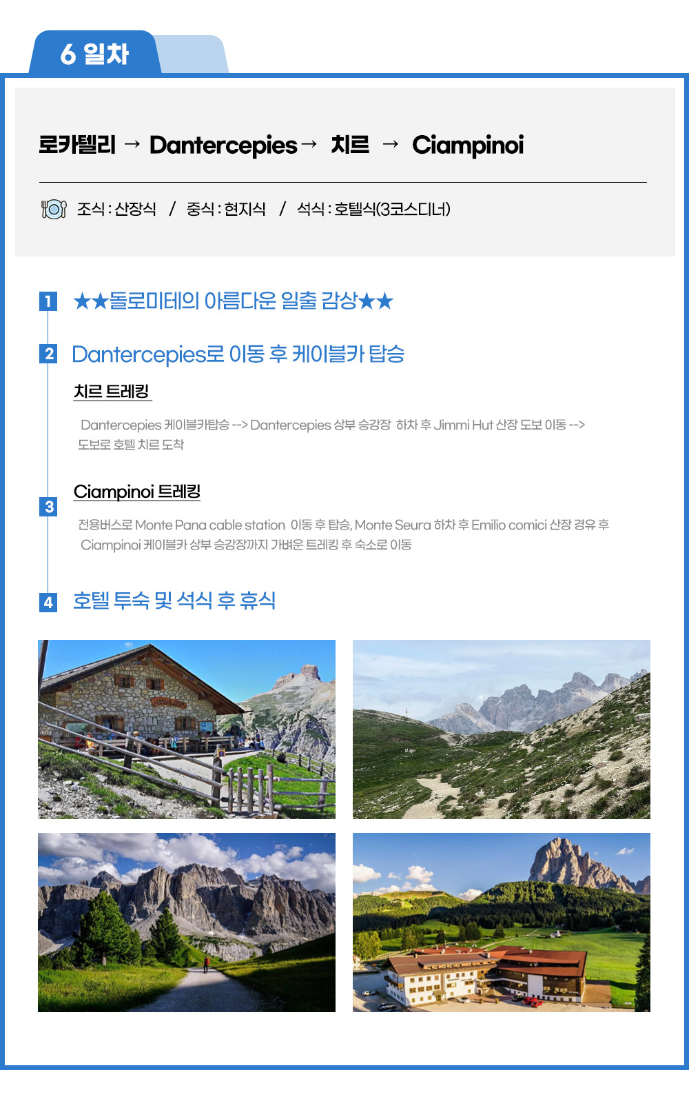 ◈ Ciampinoi 트레킹 ◑ 전용버스로 Monte Pana cable station 이동 후 탑승, Monte Seura 하차 후 Emilio comici 산장 경유 후 Ciampinoi 케이블카 상부 승강장까지 가벼운 트레킹 후 숙소로 이동(소요시간 : 약 2시간 / 거리 : 3.9km) 호텔 투숙 및 석식 후 휴식 |